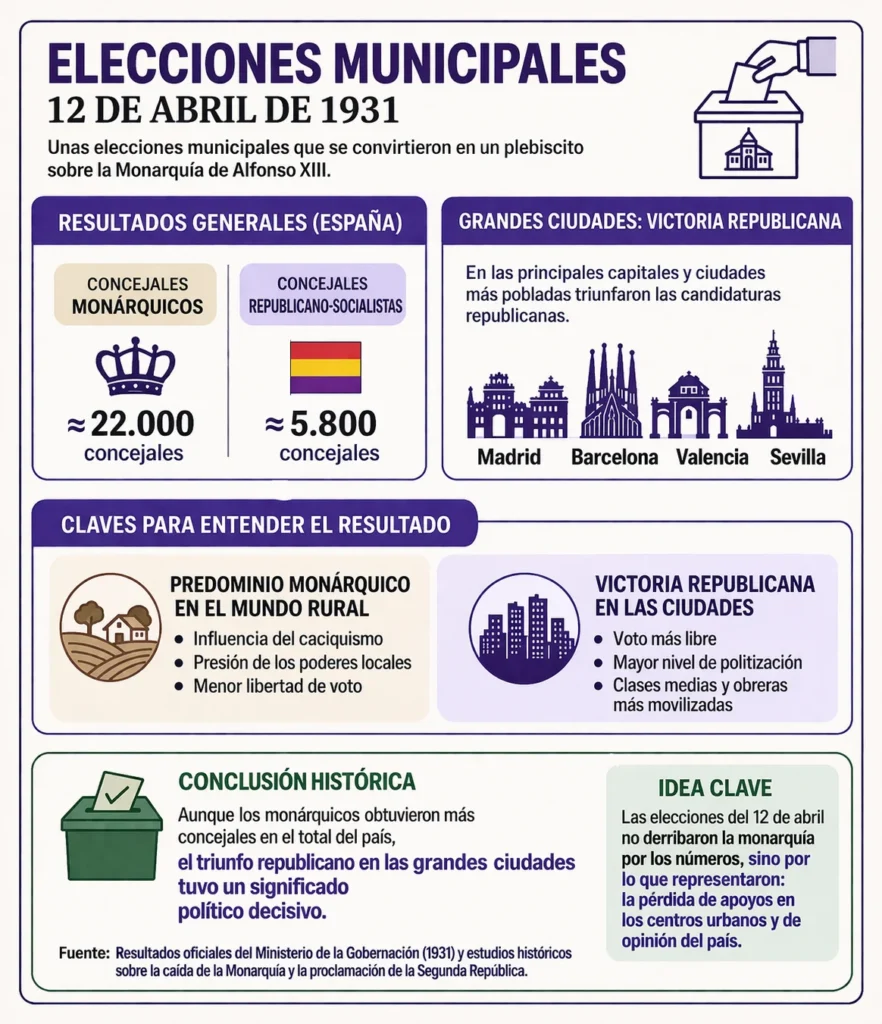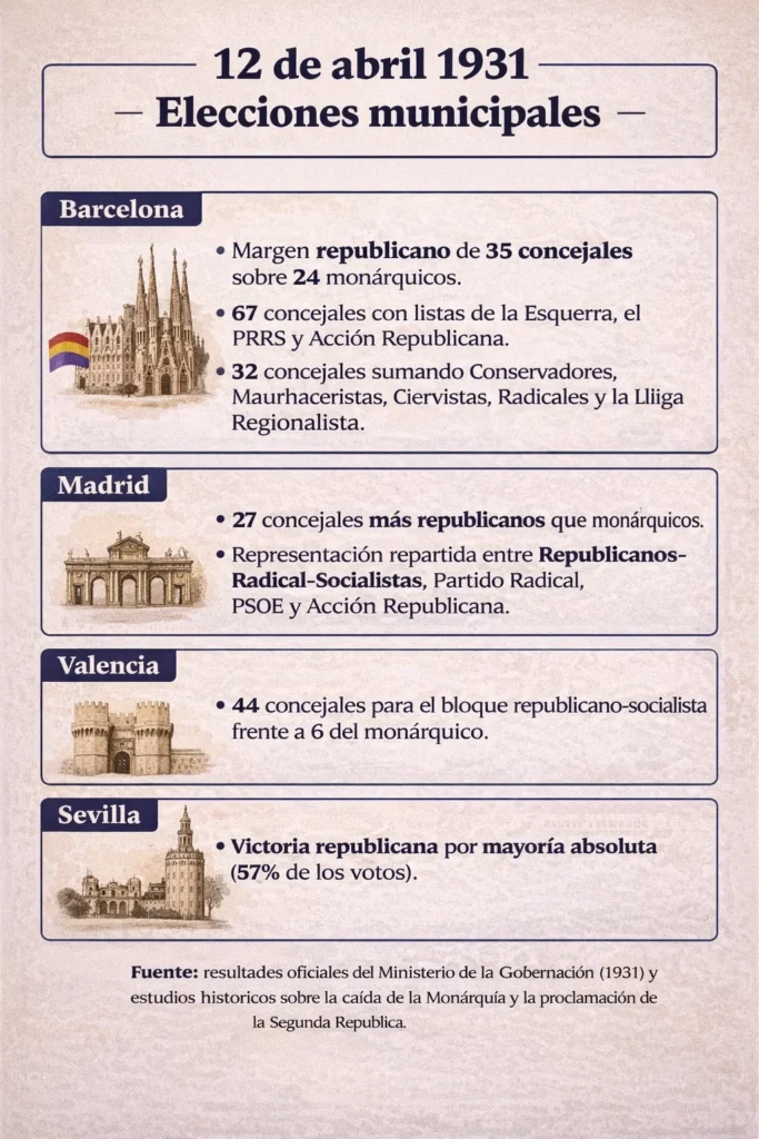 Los resultados reflejaron una realidad compleja: mientras en muchas zonas rurales triunfaban todavía las candidaturas monárquicas, en las grandes ciudades la victoria republicana fue clara y contundente. Y fue precisamente ese resultado urbano el que marcó la lectura política del momento.